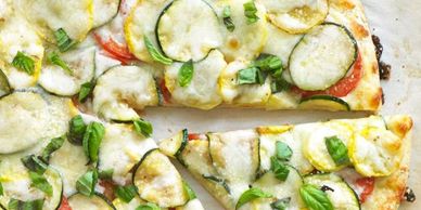 • In a medium bowl, combine the ricotta cheese, garlic salt, Italian seasoning, red pepper flakes, and chopped basil. Set aside.• Slice the summer squash into 1/8-inch-thick rounds. Put the rounds in a colander set over a bowl, toss with the salt, and let sit for about 15 minutes while they exude some of their liquid. Pick up handfuls of squash and squeeze them in the palm of your hand to release even more moisture. Then lay the squash out on a kitchen towel, fold the towel over the squash, and press down to dry the squash. Set aside for a moment. Meanwhile, center the oven rack, and heat the oven to 400°F.• Put the pizza crust on a rimless baking sheet (or, use a pizza paddle). Spread the ricotta mixture over the crust, keeping a 1/2-inch border all around. Arrange the rounds of squash in overlapping concentric circles, alternating the green and yellow slices. Drizzle with rounds with the olive oil, and finish with a dusting of the black pepper.• Slide the pizza directly onto the oven rack, and bake until the crust crisps and the squash colors slightly -- 15-20 minutes. Slide the pizza onto the rimless baking sheet, and then transfer to a wooden board for easy slicing. Let the pizza cool for at least 5 minutes before slicing into 8 wedges.• NOTE: You can use ALL green zucchini or ALL yellow crookneck squash for this pizza.t.