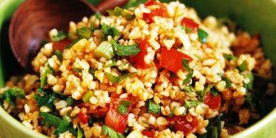 • Put bulgar wheat into a large bowl and stir in the boiling water, lemon juice, olive oil, and 1/2 teaspoon salt. Let sit at room temperature for 1 hour.• Add the scallions, zucchini, mint, parsley, 1/2 teaspoon salt and grinds of black pepper to the wheat mixture. Stir well. Then, using a spatula, gently fold in the halved cherry tomatoes.• Cover the salad and let it chill for at least 1 hour. Taste to correct seasonings.